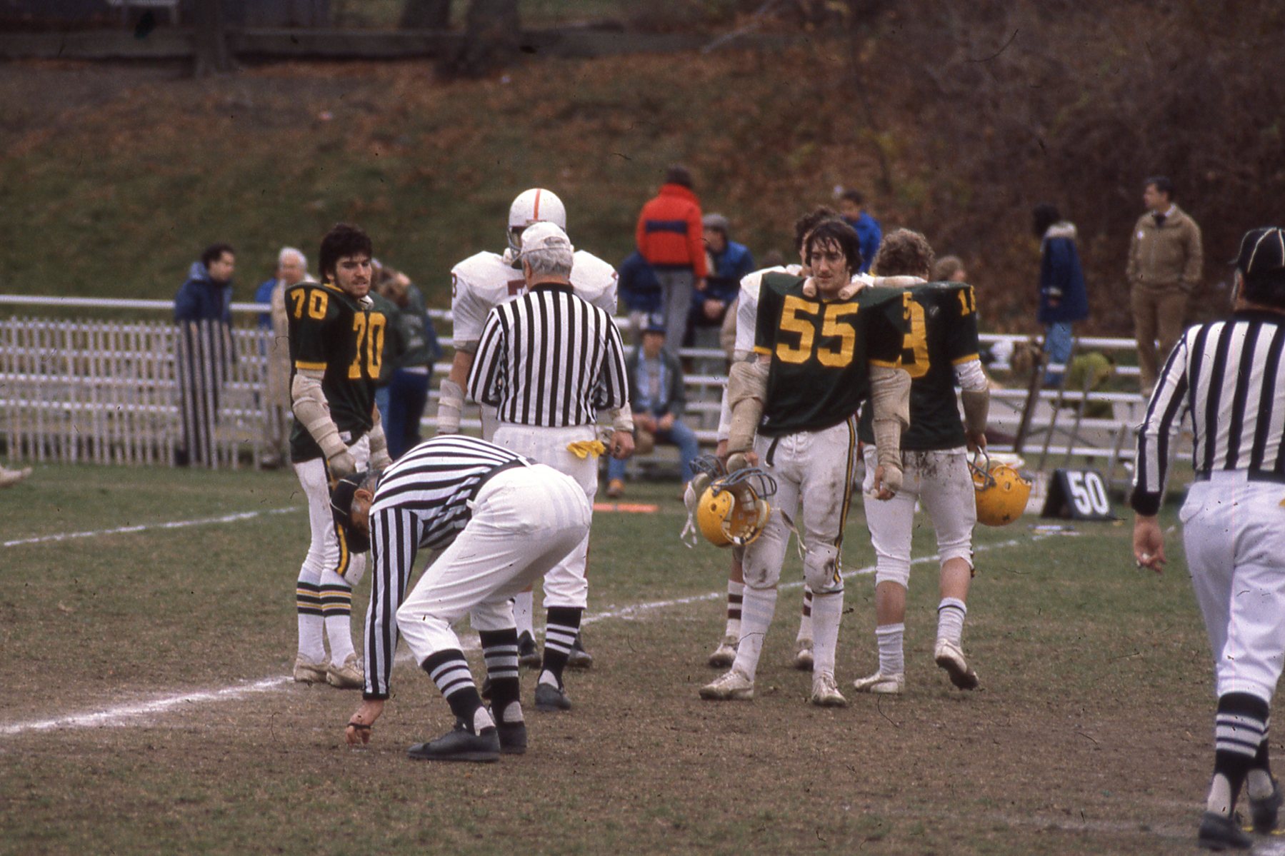 Taylor Montgomery/Gordon Solovey Football Collection. 1978-1981. Picture 279 of 296. Coin toss. 1981. Taylor Montgomery is on the left, and Terry Ryan is on the right. Justin Tunick is behind Terry.