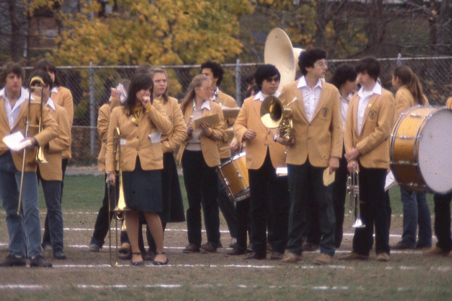Taylor Montgomery/Gordon Solovey Football Collection. 1978-1981. Picture 283 of 296. Hastings Marching Band. 1981. Identifiable are Sol Karmel, Robin Jacobs, Jen Fox, Tatsuya Suguise, Jane Mullen, Jim Borowitz, Peter Maas.
