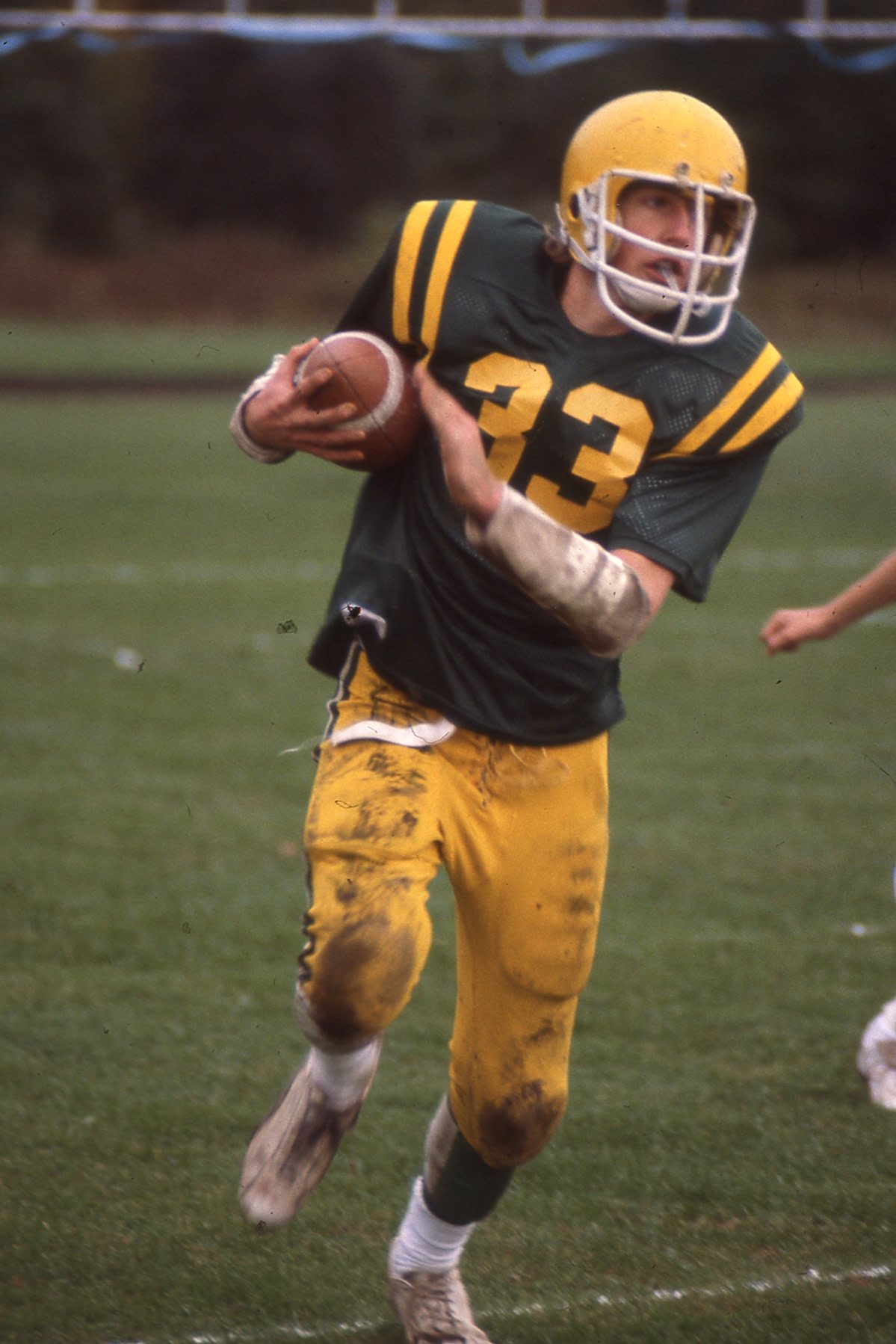 Taylor Montgomery/Gordon Solovey Football Collection. 1978-1981. Picture 38 of 296. Justin Tunick with the ball in a JV game in 1979.