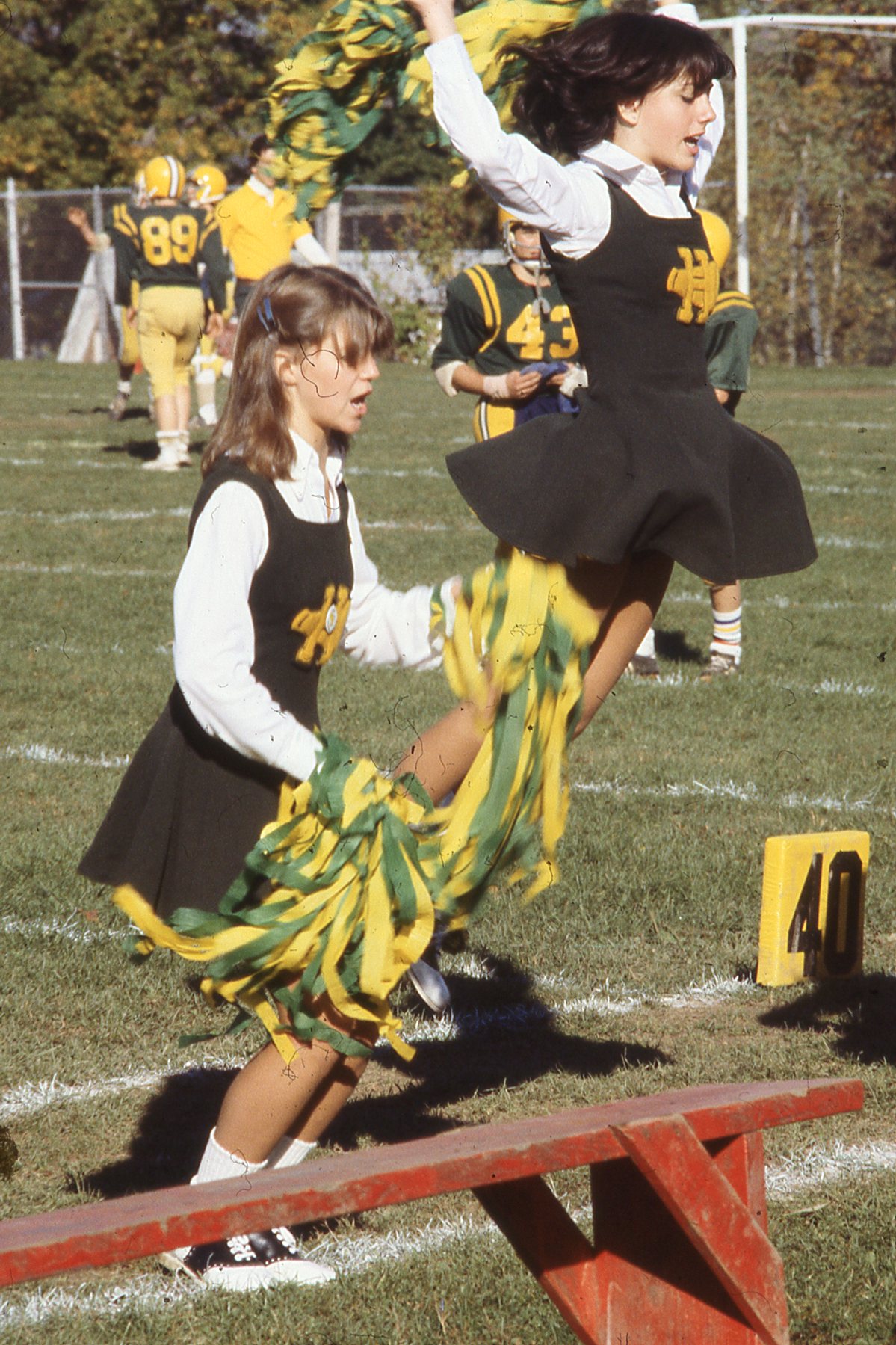 This is picture 2 of 296 of The Taylor Montgomery/Gordon Solovey Football Collection 1978-1981. JV Cheerleaders in 1978. Irene Dellacorte is airborne and Patti Wassman is on the left.